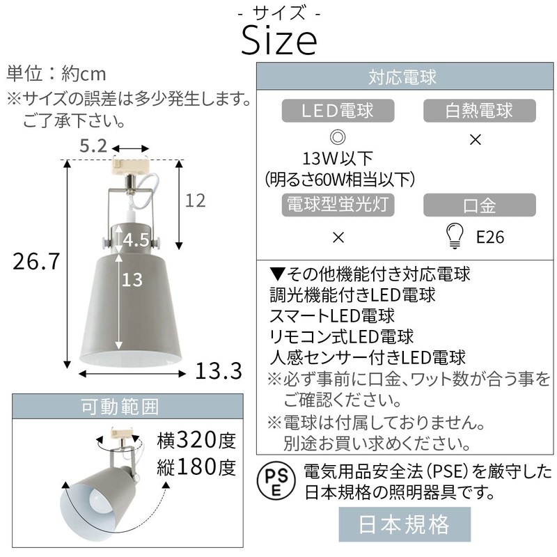 - Compatible Bulbs: LED Bulb; Base Size: E26; Rated Power Consumption: LED Bulb 13W or less (equivalent to 60W brightness); Rated Voltage: AC 100 V; Rated Frequency: 50/60 Hz; Estimated Compatible Tatami: Approx. 2 - 3 tatami mats; Shade Angle Adjustable; *Bulb not included