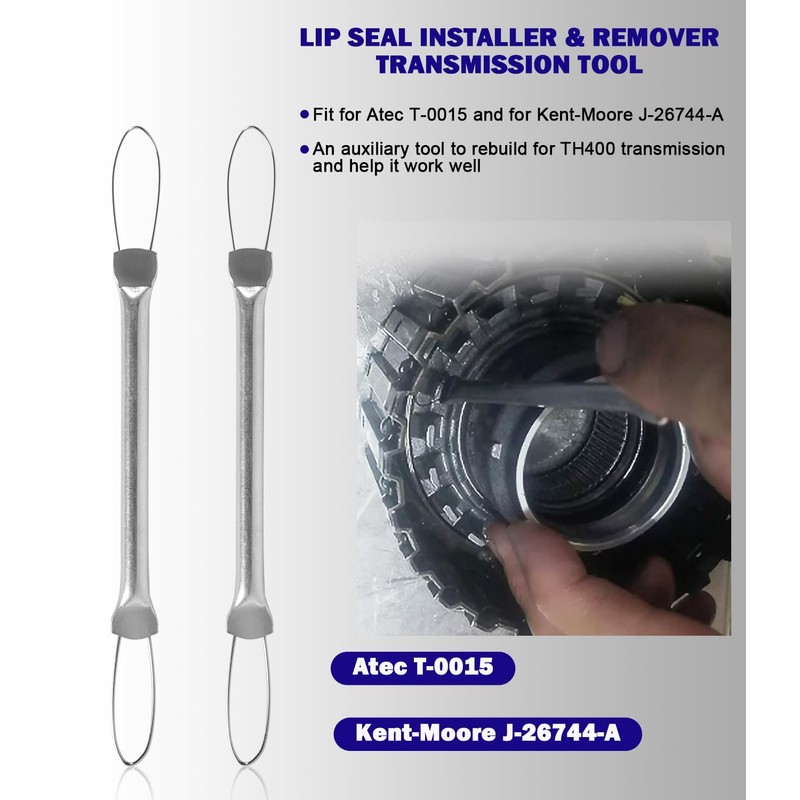The lip seal transmission tool fits for Atec T-0015 and for Kent-Moore J-26744-A. An auxiliary tool to rebuild for TH400 transmission and help it work well