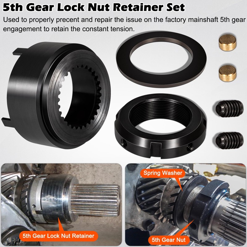 - 【Superior Material】Made from top quality steel, prevent corrosion and rust, wear and impact resistance, sturdy and durable. High precision and hardness ensure long term reliable service. Package Includes 1 x 5th Gear Lock Nut Retainer, 6 x Lock Nut Kit & 1 x 1/2" Drive Mainshaft 5th Gear Nut Wrench.