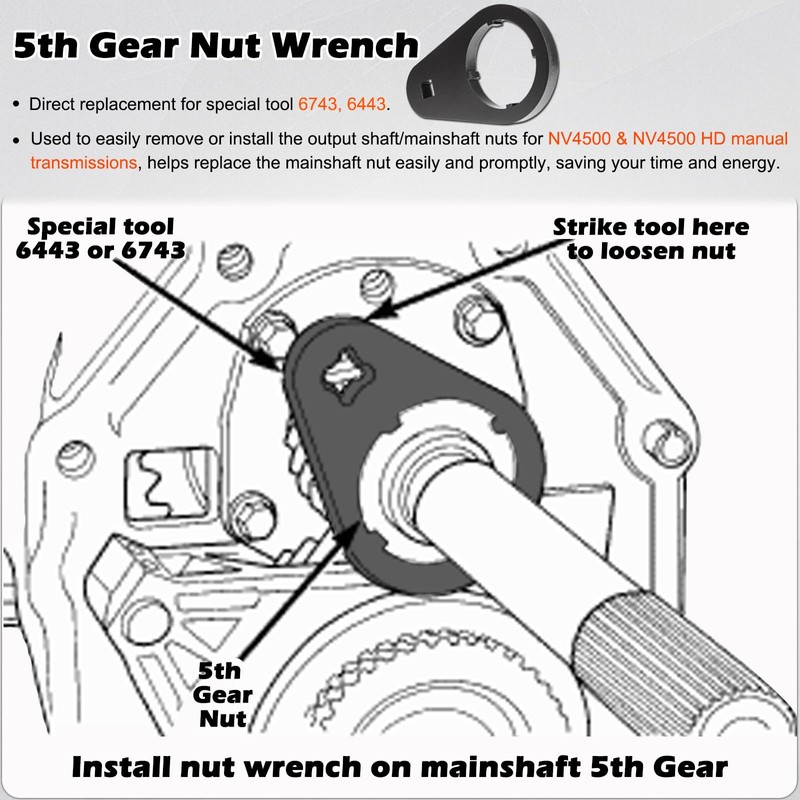 - 【High Performance】❶ 5th Gear Nut Wrench used to easily remove or install the output shaft/mainshaft nuts for NV4500 and NV4500 HD manual transmissions. ❷ 5th Gear Lock Nut Retainer Kit used to prevent and repair the issue on the factory mainshaft 5th gear engagement to retain the constant tension.