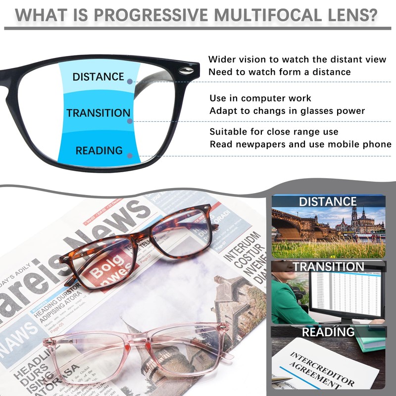 - 【Three Levels of Vision】: Progressive multifocus glasses for all your needs. The top part provides half-power magnification for walking, shopping. The middle part offers slightly reduced power magnification for working on the computer, watching TV, etc. The bottom part of the lens provides full-power magnification.