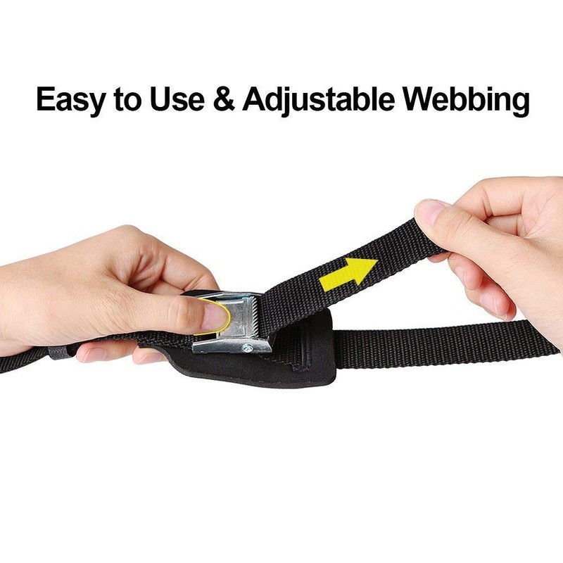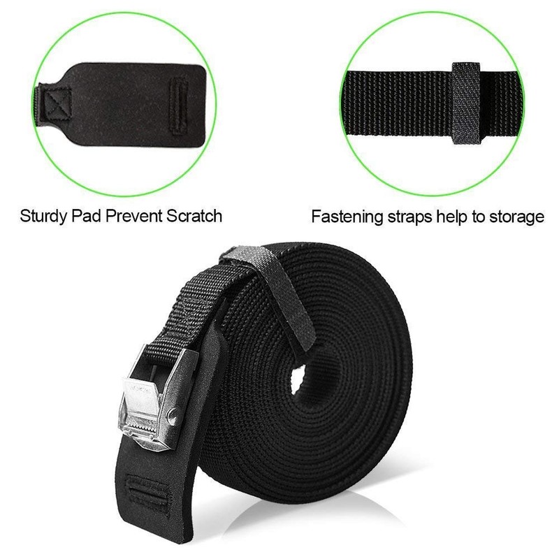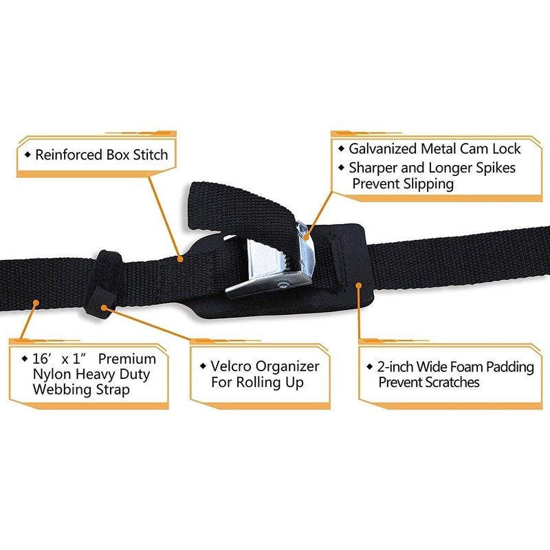 - Lashing Straps with good size and thickness foam pad, special design for protecting your vehicle and cargo. Easy storage with help of fastening cable, keeping the cam straps well organized and tidy in place.