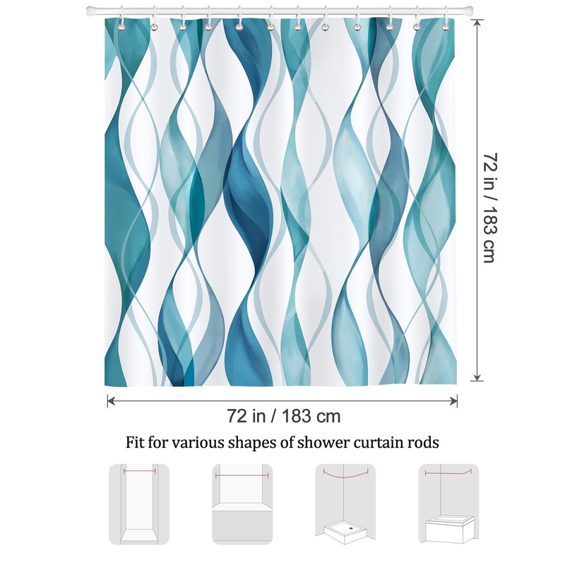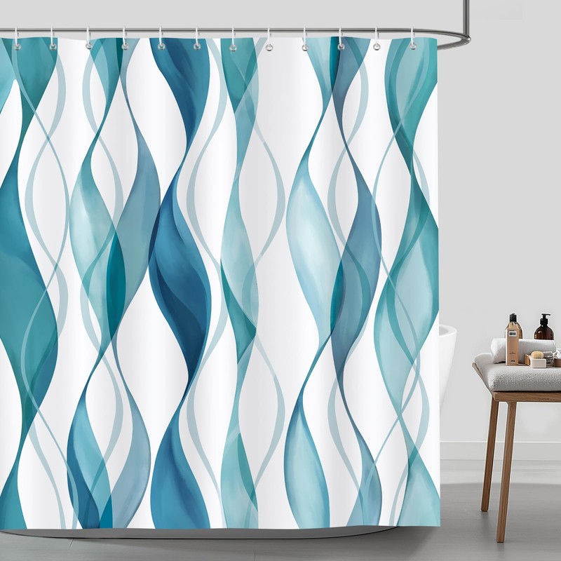 - Design: Elevate your bathroom's style with our modern striped shower curtain, featuring flowing ribbons of blue and teal, creating a soothing, contemporary aesthetic.