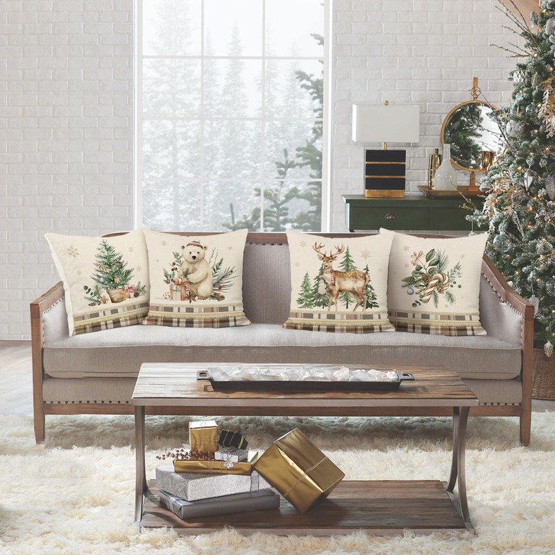 Winter Animal Design: Transform your home into a cozy winter wonderland with these winter cushion covers featuring bear and reindeer designs, snowflakes, pine trees, and khaki plaid.