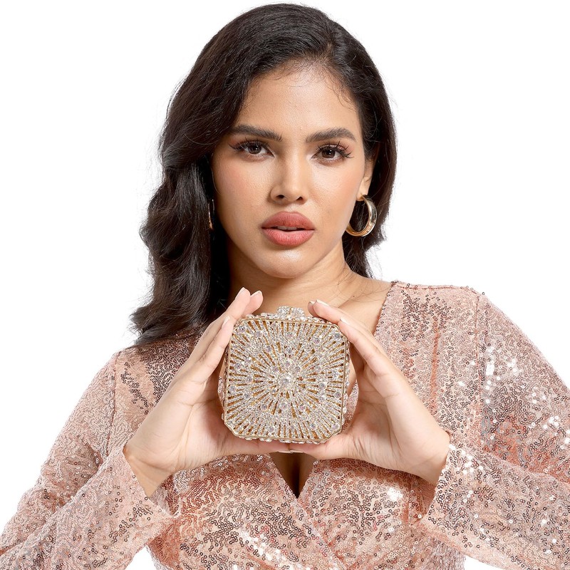 - Tamaño y peso: esta es una mini caja de minaudiere de 3.9 x 2.1 x 3.9 pulgadas, que es de aproximadamente 3.7 x 2.1 x 3.7 pulgadas. Tiene menos capacidad, no puede contener teléfonos, pero está disponible para llaves y tarjetas de crédito. Este bolso de mano con diamantes de imitación es ligero, aunque está hecho de marco de metal de trabajo fino, el peso neto es de aproximadamente 1 libra que es de aproximadamente 0,45 kg.