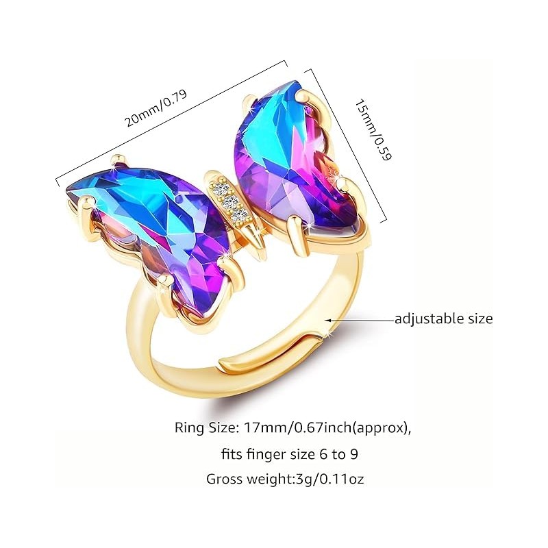 - 🦋**Comfortable Fit**: Featuring an adjustable ring design, this beautiful butterfly ring easily adapts to fit most finger sizes, providing comfort for all-day wear without causing irritation.Ring DiameterSize :0.78 inch.Butterfly Decoration:0.78*0.59 inch