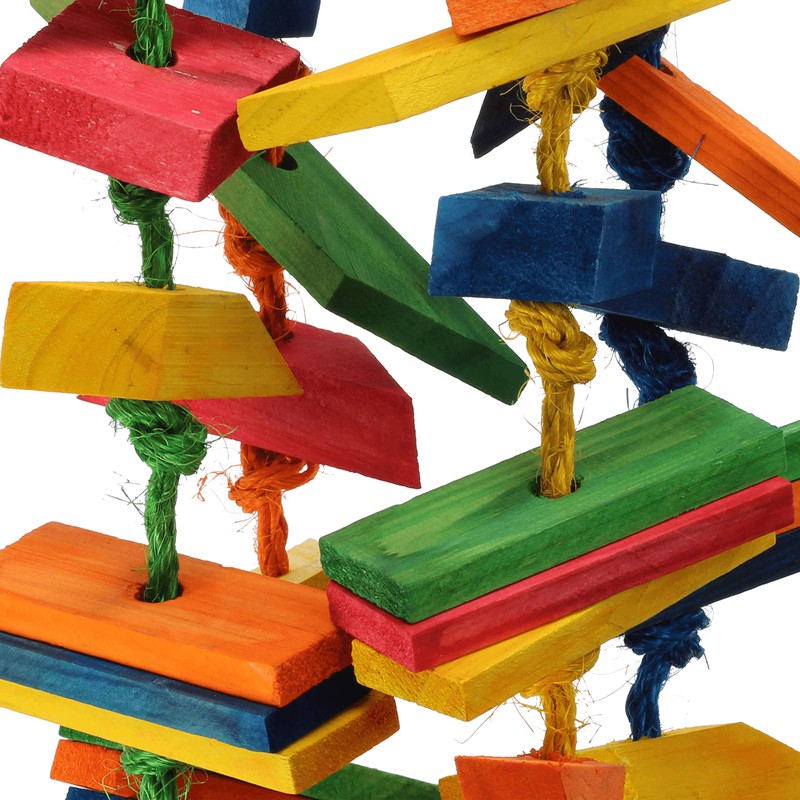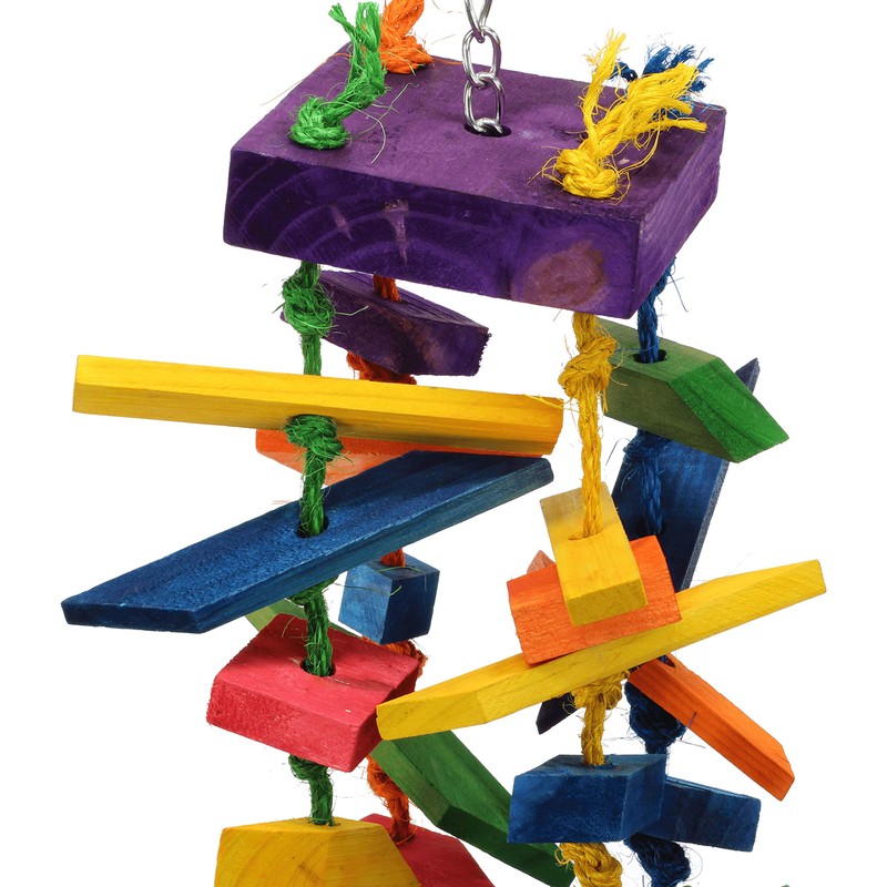 - This huge colorful bird toy has tons of colorful chewable wood pieces hanging from sisal ropes.
