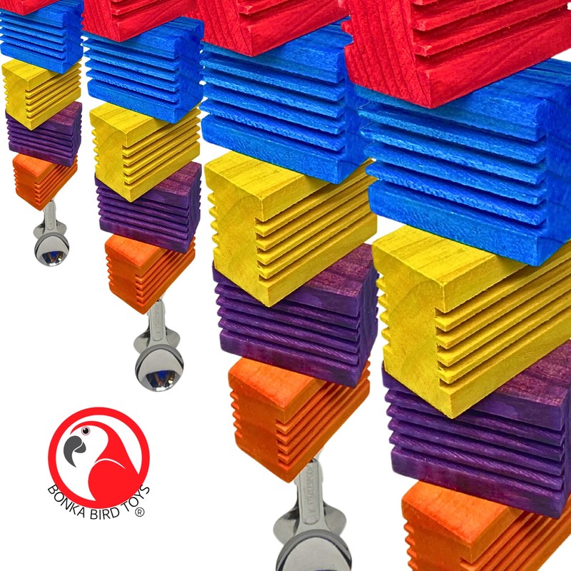 - Made from all-natural chunky wood blocks with textured grooves to encourage healthy chewing behavior and help maintain beak condition; dyed in bird-safe vibrant colors to stimulate your bird's visual interest
