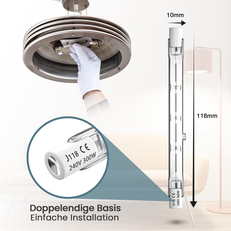 - Specifications: 300W, dimmable, AC220-240V, 5900lm, warm white 2800K, 118mm R7s halogen light bulb pencil
