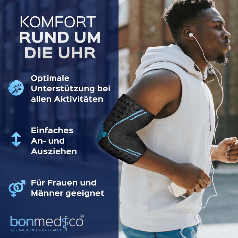 - 2 x elbow protectors. By supporting joints and muscles the elbow brace helps to stabilise and relieve your arm joint. It is made from a special compression knit. The compression prevents painful wrong movements of the arm and relieves the muscles. The slip bandage can be used when protective measures are necessary in the affected area caused by damage or overstress.