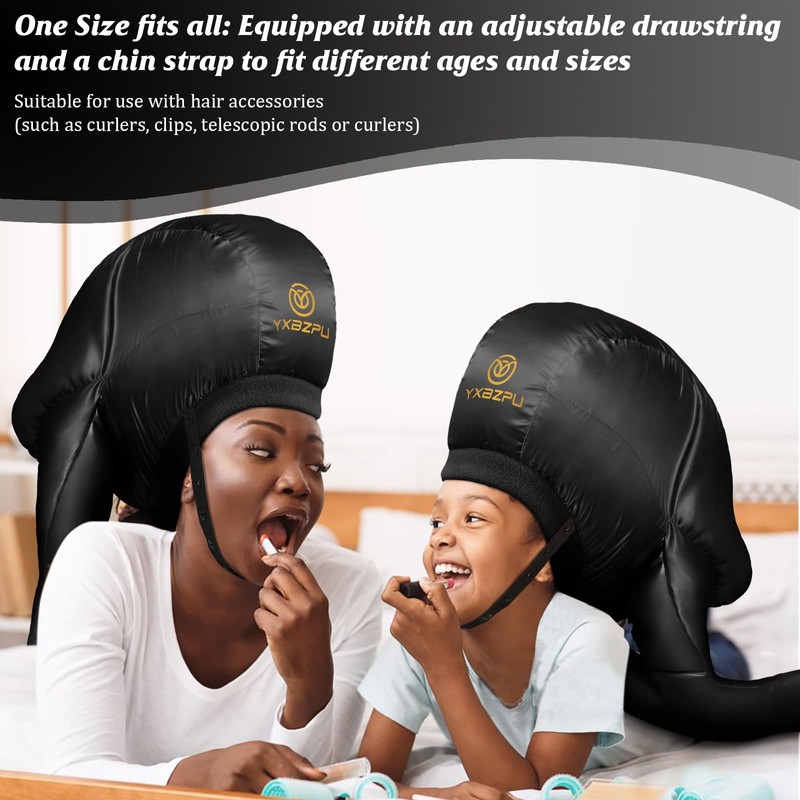 - Universal Fit & Hands-Free Comfort- Fits most heads (adjustable elastic band) and works with all standard hair dryers (110V-240V). The lightweight, breathable design lets you relax, read, or style while drying—perfect for multitasking!