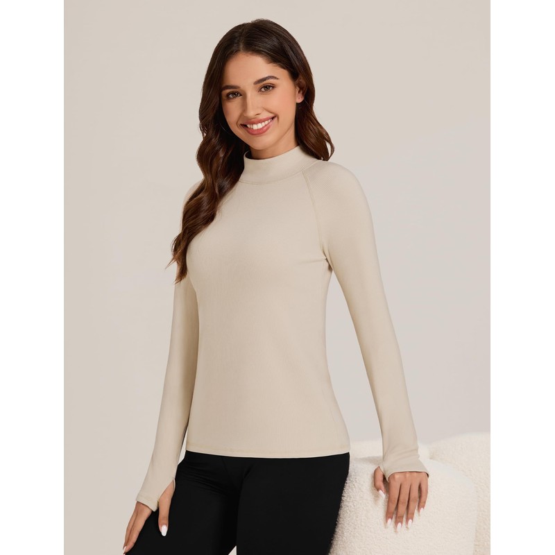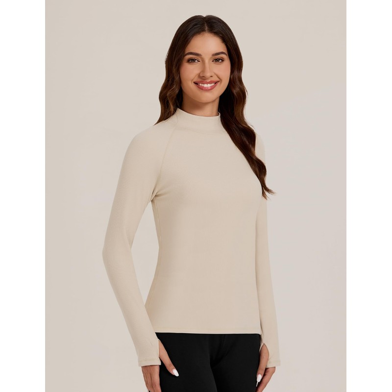 Bonneuitbebe Women's Thermal Shirts Fleece Lined Undershirt Turtleneck Ribbed Basic Tops Lightweight Base Layer Beige
