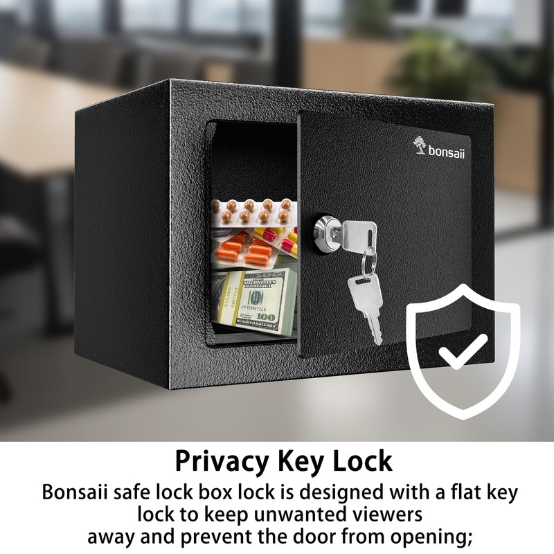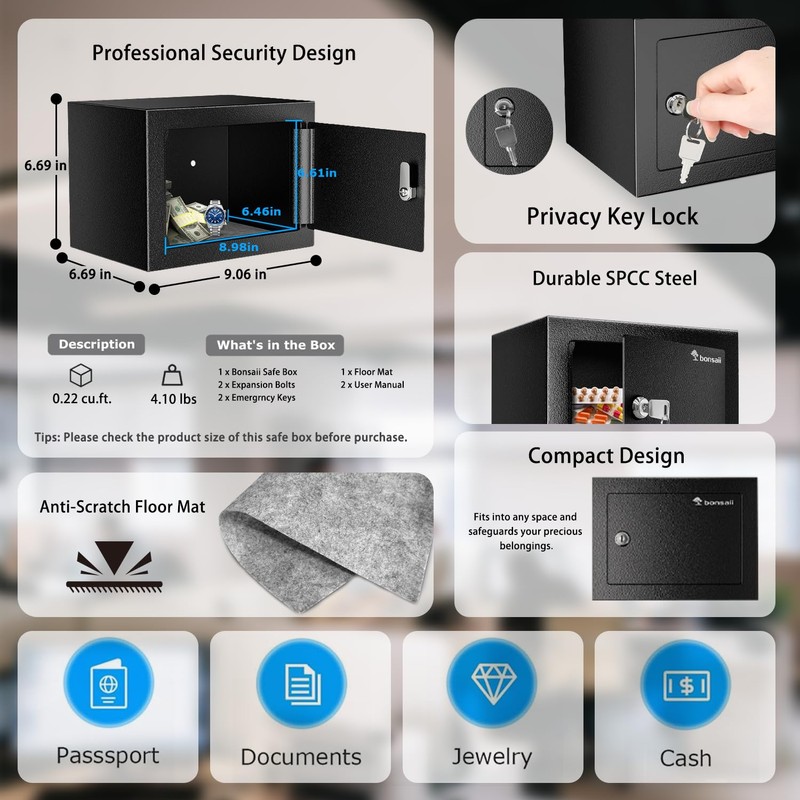 - Contents of the Package: You will receive 1 x Bonsaii Safe Box, 2 x Emergency Keys, 2 x Expansion Bolts, 1 x Floor Mat, and 1 x User Manual. Support: The Bonsaii key-locked safe box is supported by expert customer service around the clock.