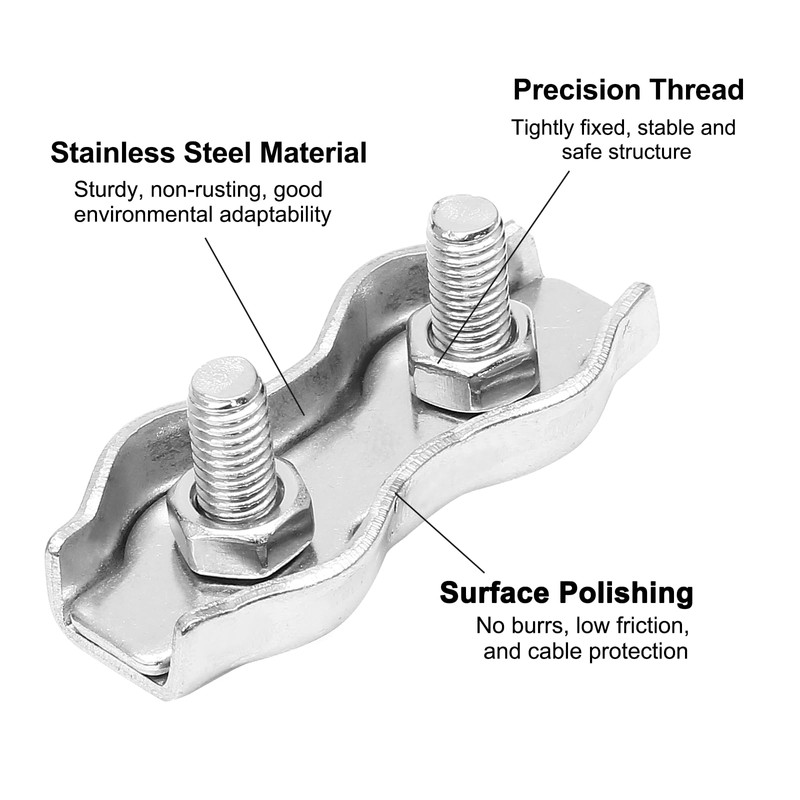 - HIGH QUALITY - Bolted wire rope clamp is stamped from 304 stainless steel thick plate. It has high strength, strong rust resistance and strong load-bearing capacity, strong and durable, and can cope with harsh environments.