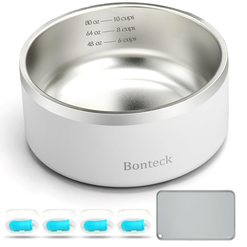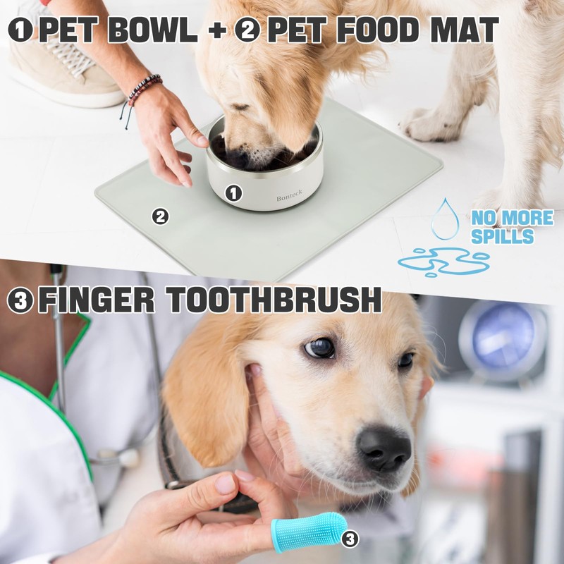 - Complete Mealtime Solution: Our dog bowl comes with a premium silicone mat and a set of four dog toothbrushes. The mat features a slip-resistant surface to help contain spills and provide stability alongside the non-slip base of the bowl. It's easy to clean, and the included toothbrushes have soft silicone bristles for gentle oral hygiene. Bonteck dog bowl is engineered as a no spill water bowl for dogs and cats, ensuring a clean feeding area.