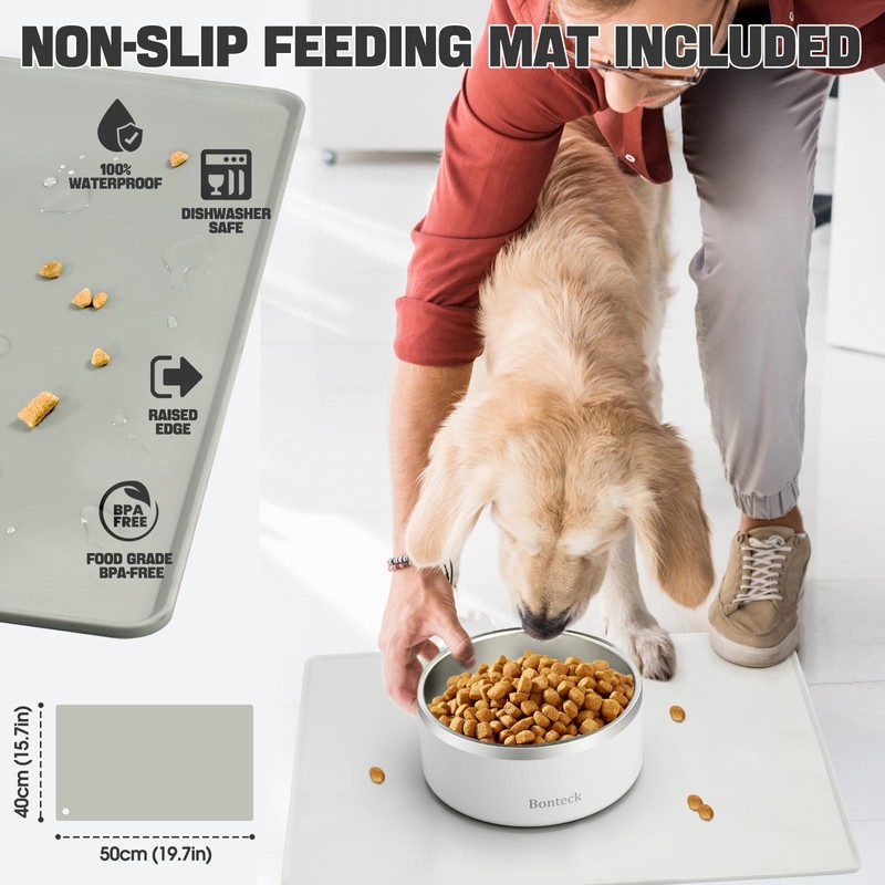 Bonteck Dog Bowl - Dog Water and Food Anti Rust & Non Slip Metal Bowls Large, Spill Proof Insulated Double Wall Pet Dish for Dogs, Cats & Pets, Stainless Steel, Dishwasher Safe (100 oz, White)