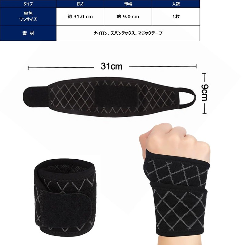 • 厚みのある丈夫な生地でつけ心地はもちろん、耐久性にも優れています。柔軟性、伸縮性に優れ、快適なフィット感で手首をしっかりと固定します。