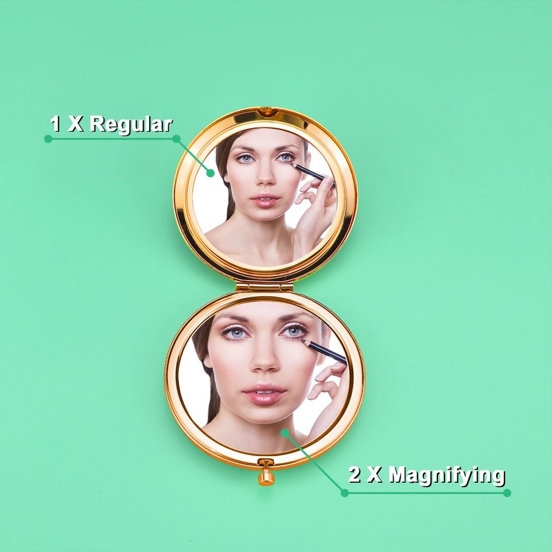 - Portable Compact Makeup Mirror:1 side is a standard mirror to help ensure that your lipstick, eyeliner and hair are in perfect condition and the other side is a magnifying mirror, an exceptionally clear image without distortion. Make sure the girl is getting the perfect look, and also allow her to check the tiniest details of your makeup.Ideal for daily use.
