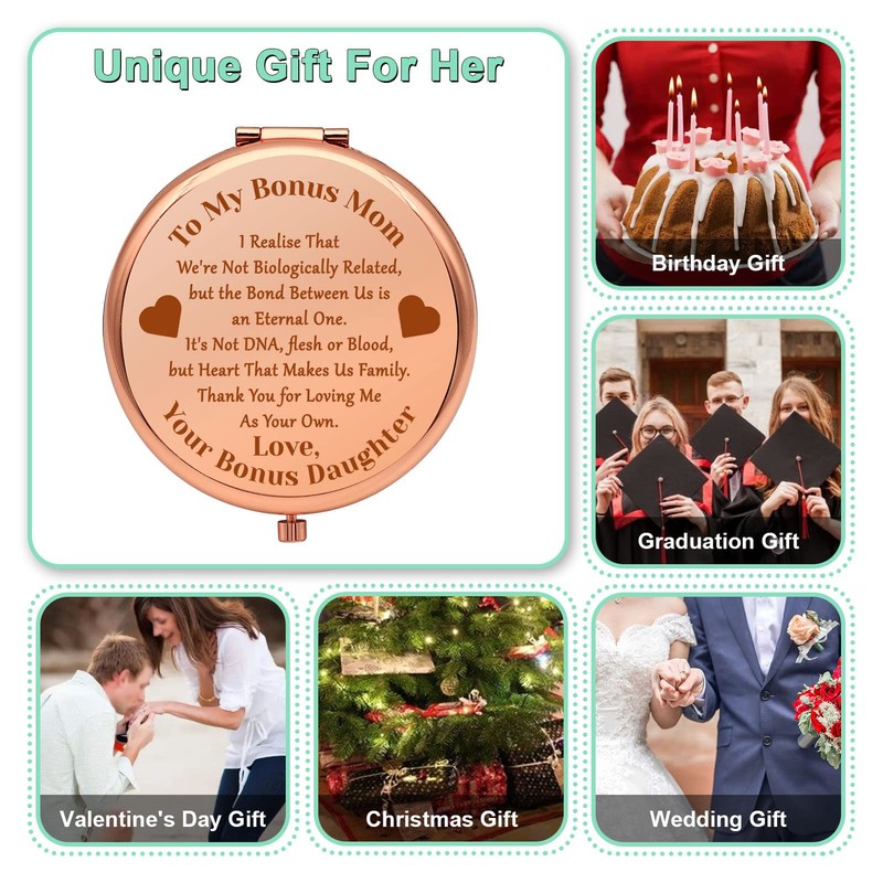 - Unbiological Mom Gifts for Women:If you're looking for some meaningful gifts for your bonus mom, these pocket makeup mirrors are good choices for your stepmother on occasions like Valentine's Day, wedding, Thanksgiving, Mother's Day, birthday, or Christmas Day, show your love to your bonus mom.