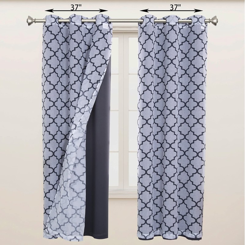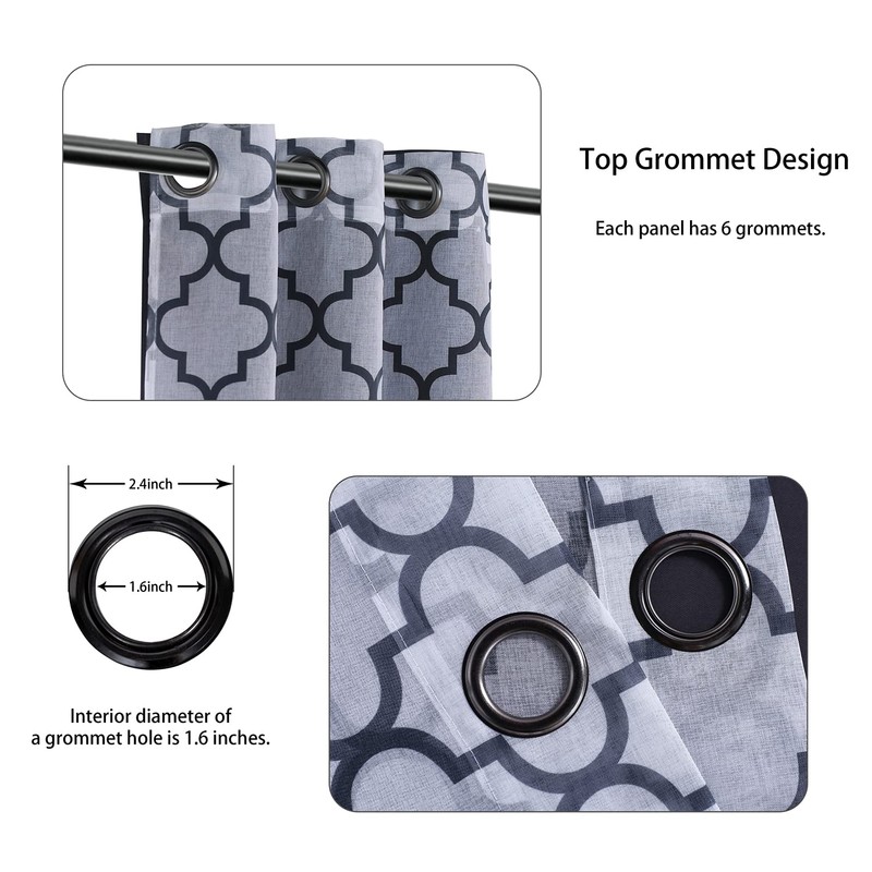 - WHAT'S IN THE PACKAGE?: Each set includes 2 pieces moroccan print sheer curtain and 2 pieces blackout curtains. Each curtain panel measures 37 wide by 84 inch long and finished with 6 grommets with 1.6 inch diameter that fits well with standard curtain rods, making them easy to install and move along the pole.