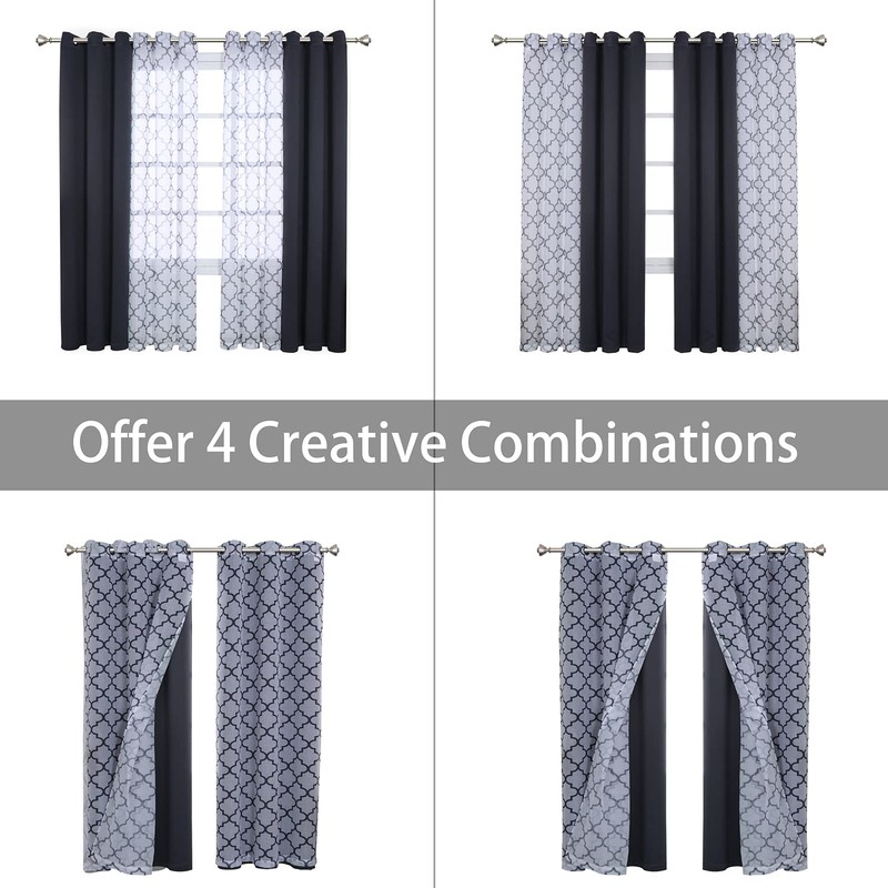 - OFFER MORE CREATIVE COMBINATIONS: 2 sheer curtain panels and 2 room darkening curtains can be hung in many creative ways as you like. Combining the moroccan printed voile sheer curtains and soft blackout curtains will add a touch of luxury to your home.