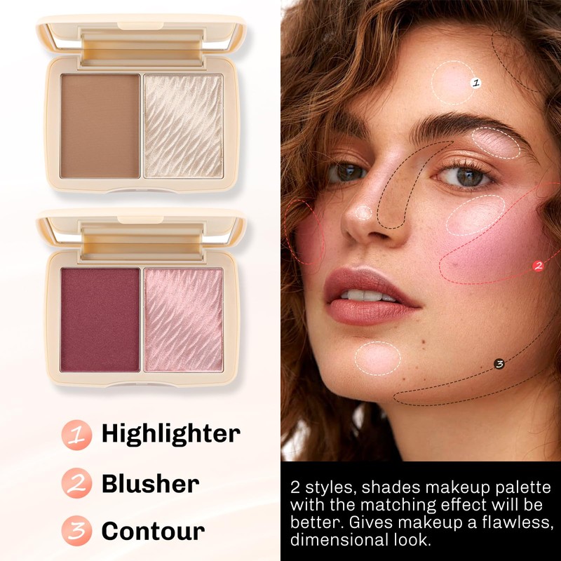 - Available in 4 Style Shades: Face blush powder palette matte or shimmer in different shades, and highlighter contour powder palette. Each palette comes in 2 colors to illuminate and sculpt define facial features