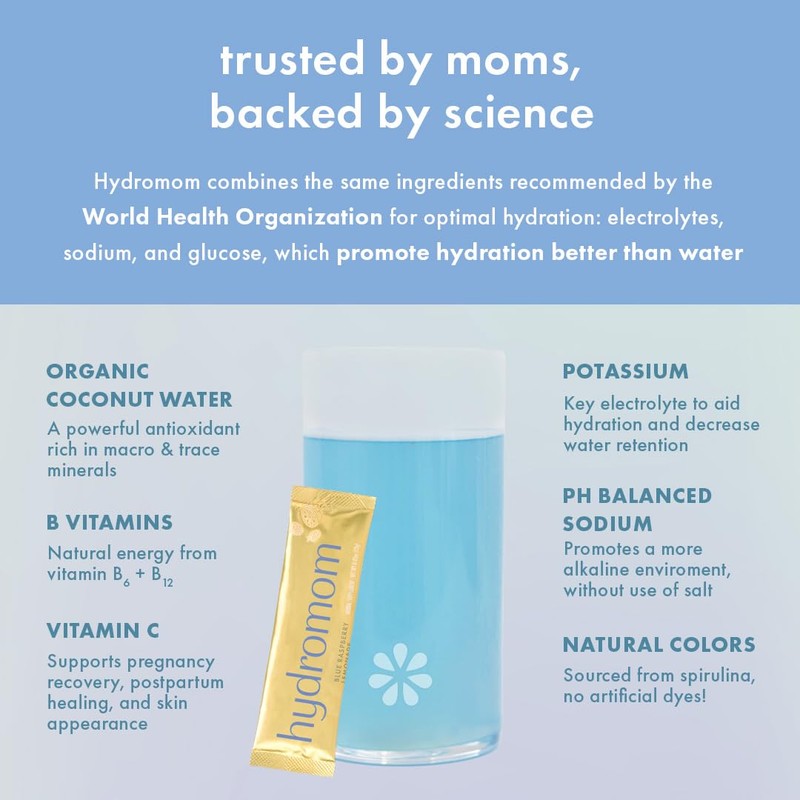 Hey, mama! Meet your new hydration hero! Hydromom is a must-have drink mix to help stay energized and hydrated that is perfect for every stage of motherhood. Whether you're soothing morning sickness, boosting milk supply, or just trying to stay hydrated through the busyness of #MomLife, Hydromom hydration packs have you covered. Packed with essential electrolytes, sodium, glucose, and B vitamins, these hydration drinks are ideal for any stage of motherhood and whatever their day may bring. It's not just a drink powder; it's a lifestyle boost for every mommaking it a perfect gift for new moms or handy travel essentials for women in the phase of pregnancy, lactation, or beyond. With a convenient individual drink packet design, this electrolyte mix is perfect for on-the-go hydration or as an addition to any new mommy essentials kit. Simply rip the packet, pour it in, and turn every sip into a moment of TLC for your hardworking, mama body!