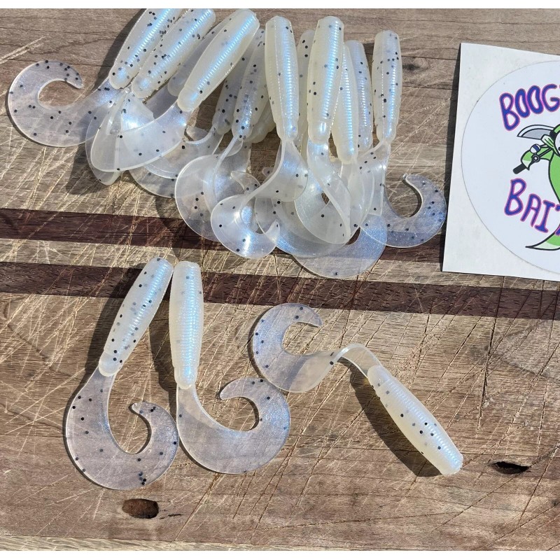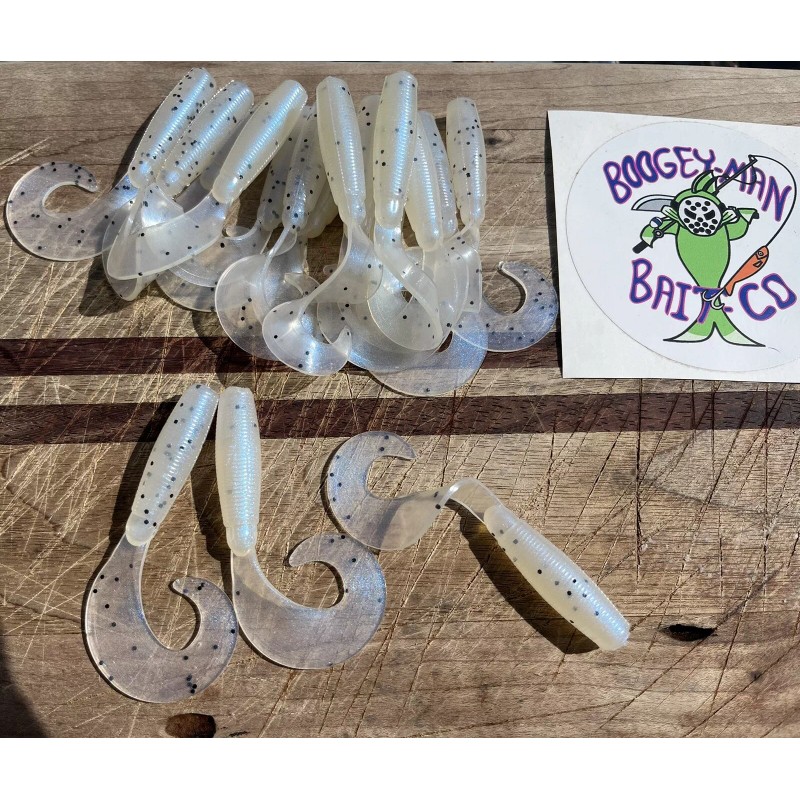 The Boogey Man Bait Co. 4” Curl Tail Grub This is a 20 pack in Monkey Milk that glow in the dark. These grubs are lights out for a variety of both freshwater and nearshore saltwater species