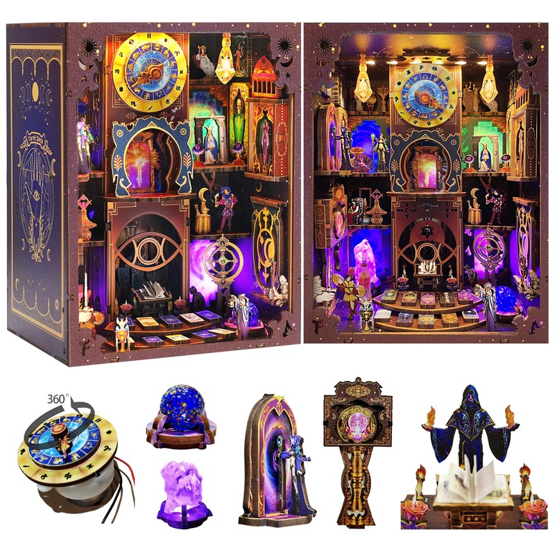 - 【Enchanted Tarot Design】 Step into a mystical realm with this Fantasy Tarot Book Nook Kit. Inspired by tarot symbolism, it features intricate details like the Magician's Altar and Moon Card celestial motifs. The dynamic LED light strip auto-adjusts brightness, casting an ethereal glow day or night.
