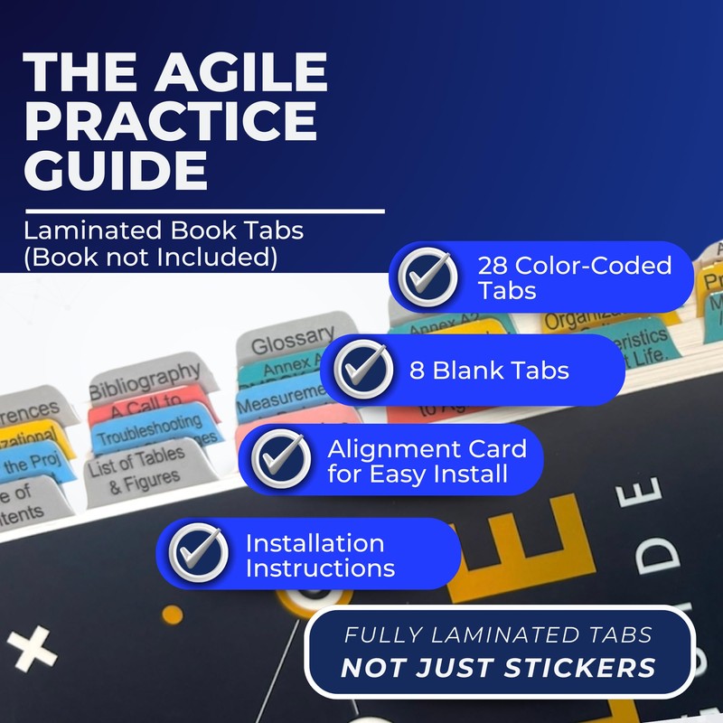 - Laminated Durable Tabs: The tabs are laminated with 3 mil film for durability and stiffness and made specifically for The Agile Practice Guide