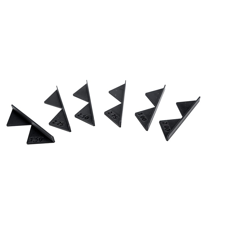 BOOKBINDING Corner Cutting JIG Set 6 - 10 pcs! Comes with 6 -10 thicknesses depending on package: 1.50mm (1/16") 2.00mm (5/64") 2.25mm 2.50mm 2.75mm 3.00mm (1/8") 4.00mm (5/32") 5.00mm 6.00mm (1/4") 12.00mm (1/2") Make Bookbinding quicker , more precise and stress free ! Easy to use ! Just place at corner,cut your turn-in material along the line and you have perfect angled edges to fold over !