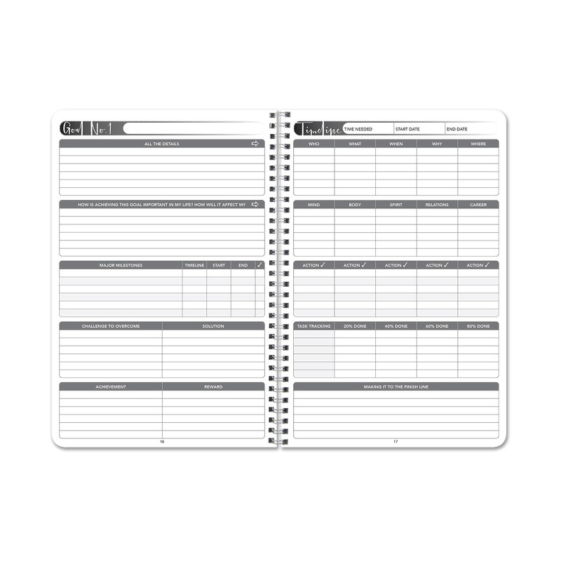- LIST YOUR GOALS AND ALL CHALLENGES AND DETAILS: In a two-page spread, there are spaces for you to track all the details involved in reaching your goals. Spaces to write major milestone, challenges to overcome, the solution to resolve it, task tracking, and how and why the goals you have are important to you – keeping you motivated!