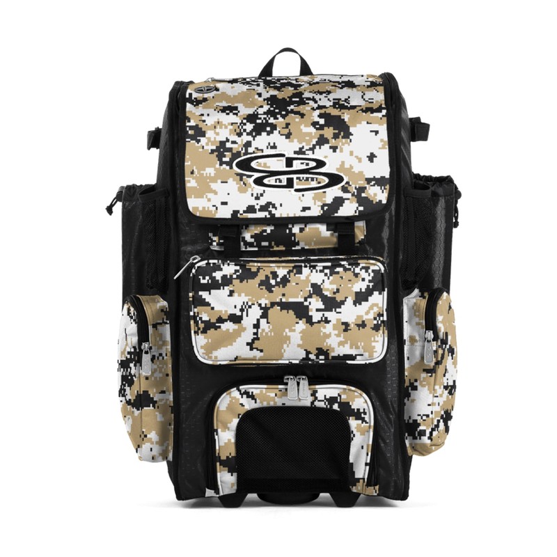 Boombah Rolling Superpack Baseball/Softball Gear Bag - 23-1/2" x 13-1/2" x 9-1/2" - Digital Camo Black/Vegas Gold - Telescopic Handle - Holds 4 Bats - Wheeled Version