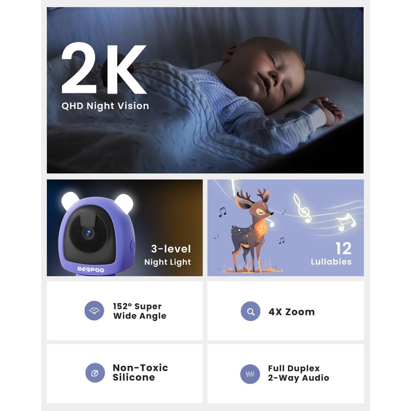 - 2K Super HD Night Vision & Night Light & 12 Lullabies: Offers 3MP resolution for clear video, up to 32FT/10M even in darkness. Built-in night light and 12 lullabies help soothe your baby to sleep.