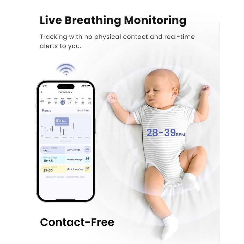 - Contact-free Breathing Monitoring: Advanced AI technology captures and analyzes your baby's breathing data without contact, ensuring an undisturbed rest. Receive real-time alerts without a subscription.
