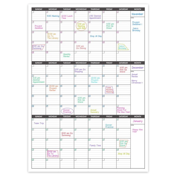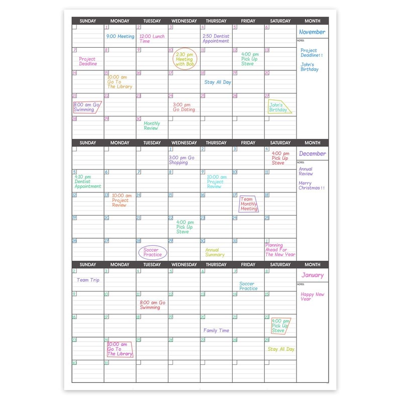 • EXTRA-LARGE DRY ERASE CALENDAR This dry erase calendar for wall covers 3 months of your quarterly plans, easily to keep track of your important events, special deadlines, appointments, activities and more. Black and white design is more simple and business style.