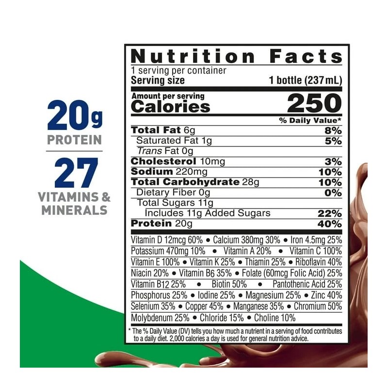 - Rich chocolate protein drink with 20 g of high quality protein for muscle health plus 27 vitamins and minerals per bottle