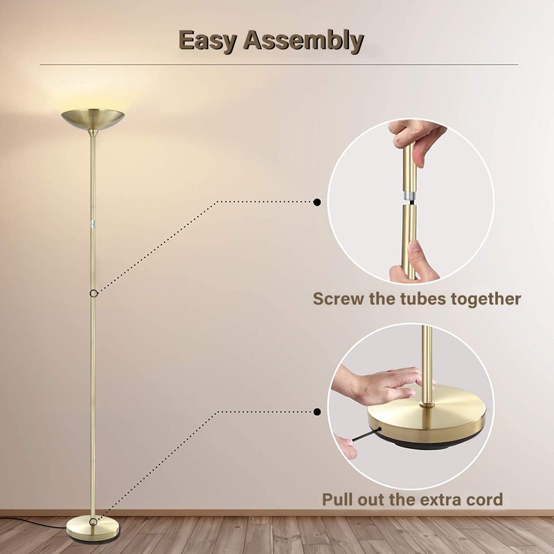 - Easy Assembly and Stylish Design; No extra tools needed, the standing lamp can be set up within 10 mins, you just need to screw all the parts together by following the installation video or instruction; Thanks to its compact size and modern design, the floor lamp can match a variety of home decor styles; The black floor lamp can be floor lamps for bedrooms, floor lamps for living room, and floor lamp for office; More than a lamp, this torchiere floor lamp is a decoration as well