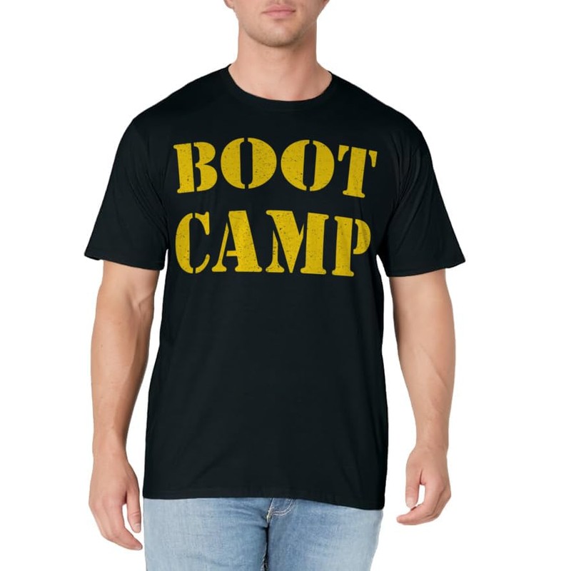 - Vintage design says "BOOT CAMP" in official, classic military stencil in authentic army and navy yellow.