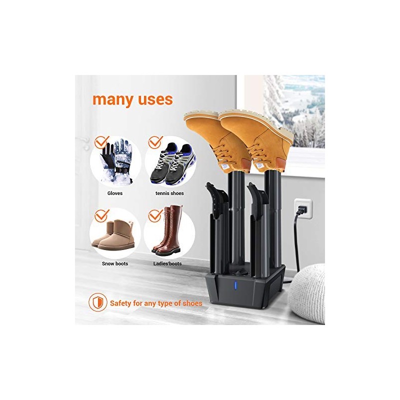- CONVENIENT TIMER: So that your shoes get the right amount of dry and no more, the unit comes with a handy, adjustable timer (30-180 min), along with overheat protection: When it senses the temperature is too high, it will automatically turn off. Let it do its thing overnight and wake up to a pair of fresh, dry shoes!
