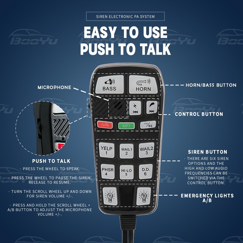 - 18 Different Siren Tones --- This Emergency Warning Horn siren PA system offers the essential function of 18 different siren tones, wail, yelp, horn, horn-1, horn-2, aux. Pre-wired unidirection microphone with PTT (push to talk) button overrides the siren during time of usage.