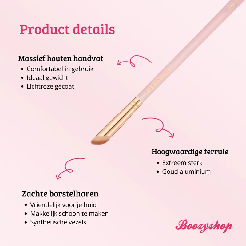 The Boozyshop Soft Pink & Gold Rounded Angled Brow & Liner Brush is a versatile makeup brush with which you can not only optically lift your eyebrows, but also emphasize your lower lash line. Thanks to the rounded bristles, this makeup brush is perfect for applying and blending your eye shadow along your lower lash line. Moreover, this brush is indispensable for optically lifting your eyebrows as it follows the natural shape of your eyebrows and is therefore ideal for applying highlighter under your eyebrows. And if that's not enough, this makeup brush makes it very easy to create an open and fresh look by applying highlighter to the inner corners of your eyes.