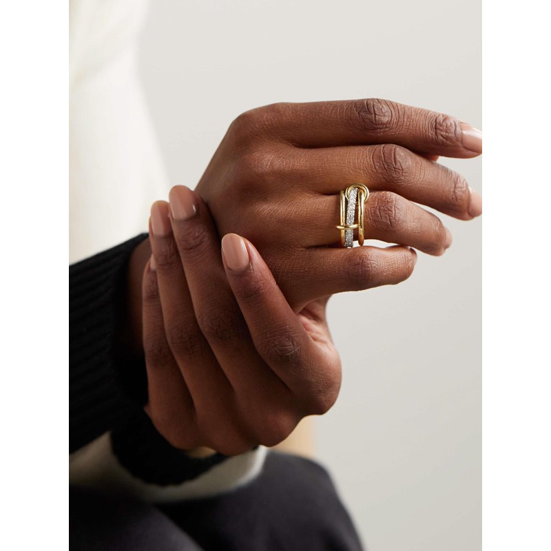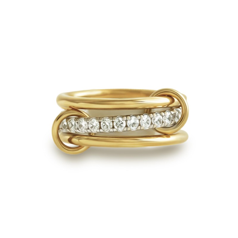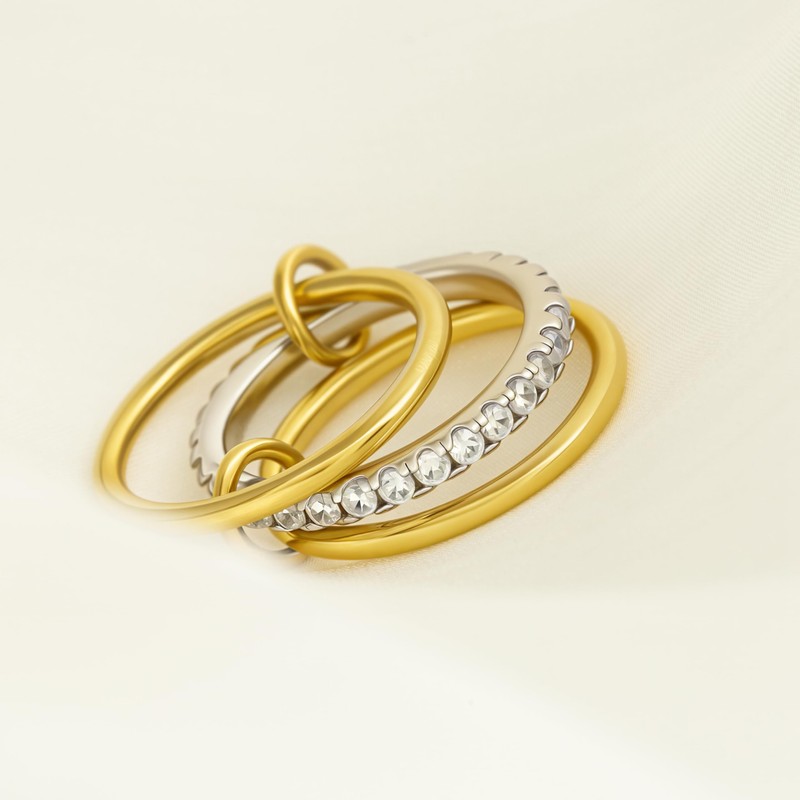 - [Mixed Metals Stack Rings] - The stackable ring consists of three rings, two silver, one gold, connected by a small gold ring, creating a sleek, minimalist ring set that is sure to make your fingers look distinctive and sparkly.