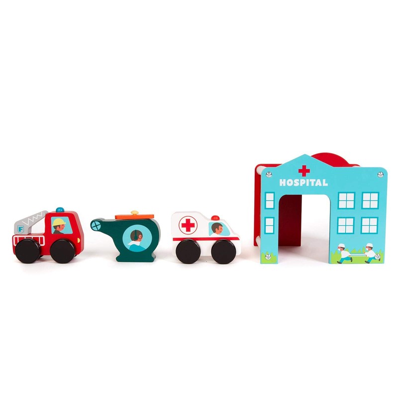 - 3 EMERGENCY RESCUE VEHICLES: 3 emergency response vehicles are included—a helicopter with rotating wooden blades, an ambulance and a fire engine with rotating ladder.