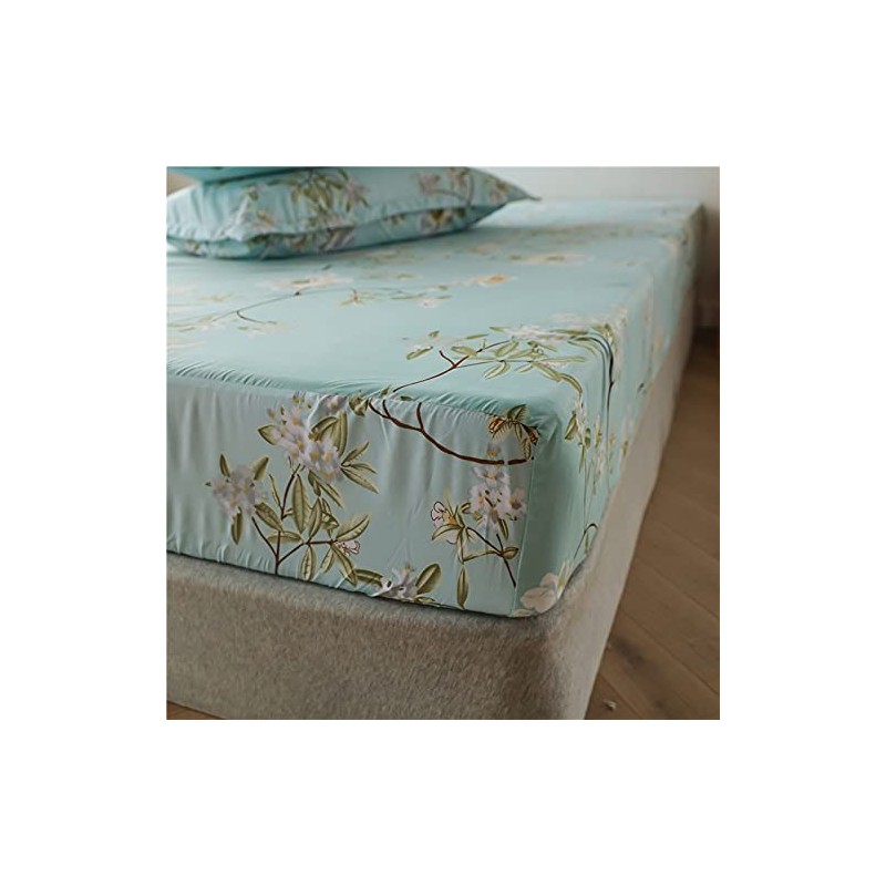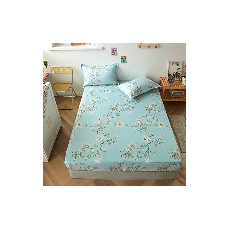 Boqingzhu Fitted Sheet 140 x 200 cm Green White Flowers Microfibre Fitted Sheet for up to 30 cm Mattress