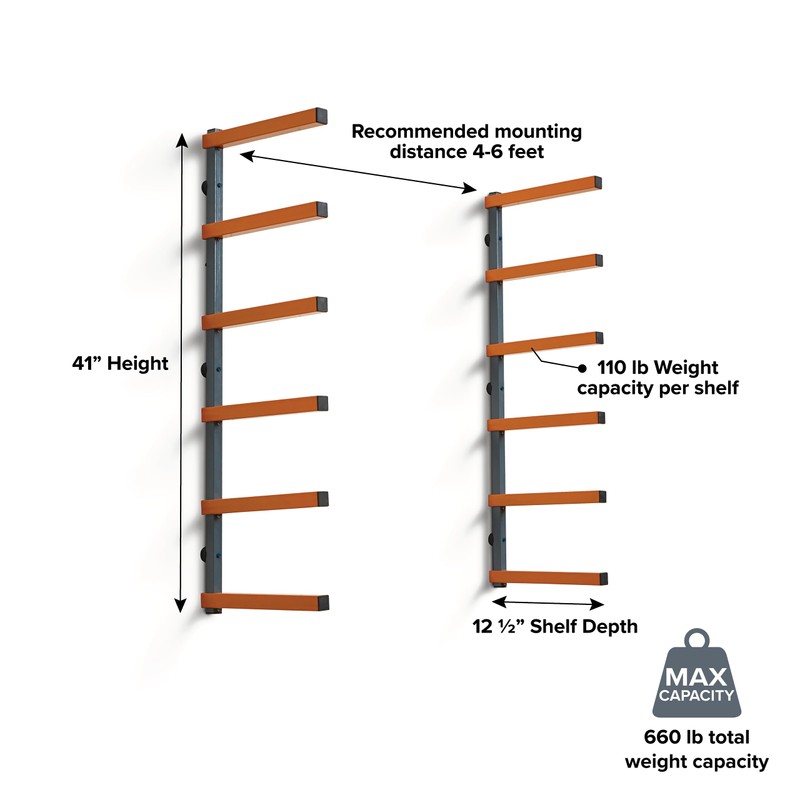 Bora Wood Organizer and Lumber Storage Metal Rack with 6-Level Wall Mount – Indoor and Outdoor Use, In Orange | PBR-001