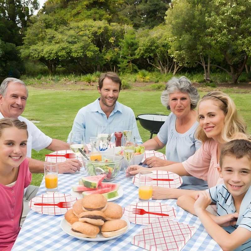 - Red and White Plaid Party Supplies Serve 50:Disposable Red and White Plaid Party decorations set included 50pcs 9" red gingham dinner plates,50pcs 7" red plaid dessert plates,50pcs disposable red gingham napkins and 50pcs forks,can serve 50 guests,enough quantity to meet your party needs and daily replacements.