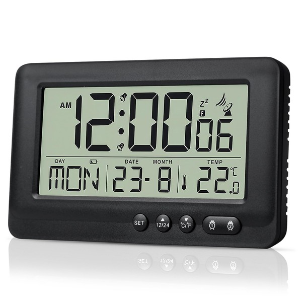 Digital Alarm Clock, Wireless Alarm Clock, with Date, Month and Temperature Display, 144 x 86 x 30 mm, Black