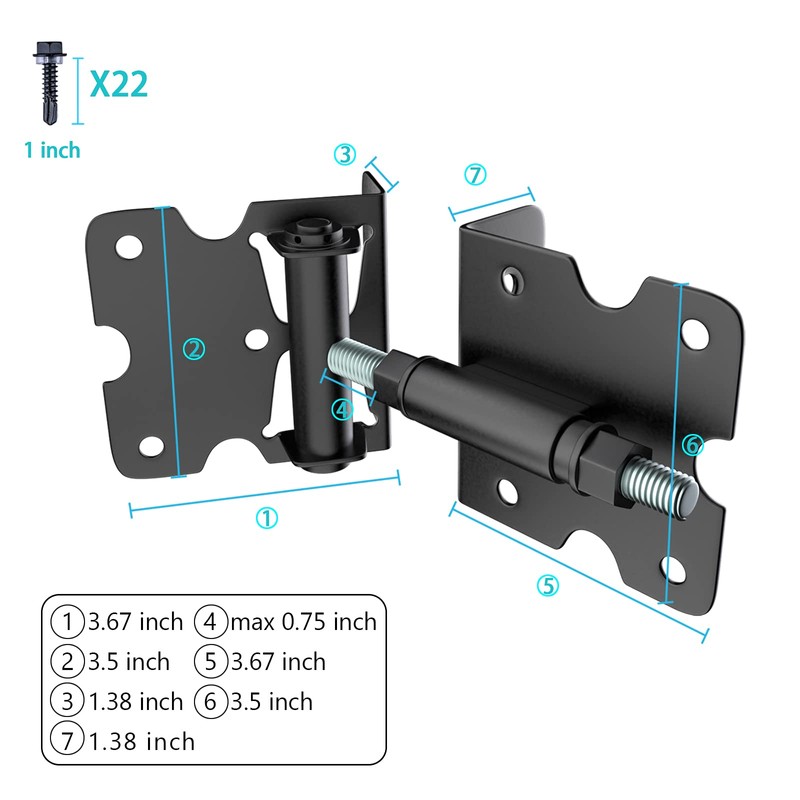 - Self-closing gate hinges: Adjust the spring to a appropriate place, the spring tension is strong enough to achieve your desired smooth self-closing speed. With longer threaded rod adding more adjustability and stability, you can adjust the distance between gate and flanges by a simply nut screwing. The gate hinges can be adjusted from 0.23" - 1.25" gap between the gate post and gate.
