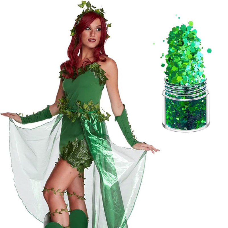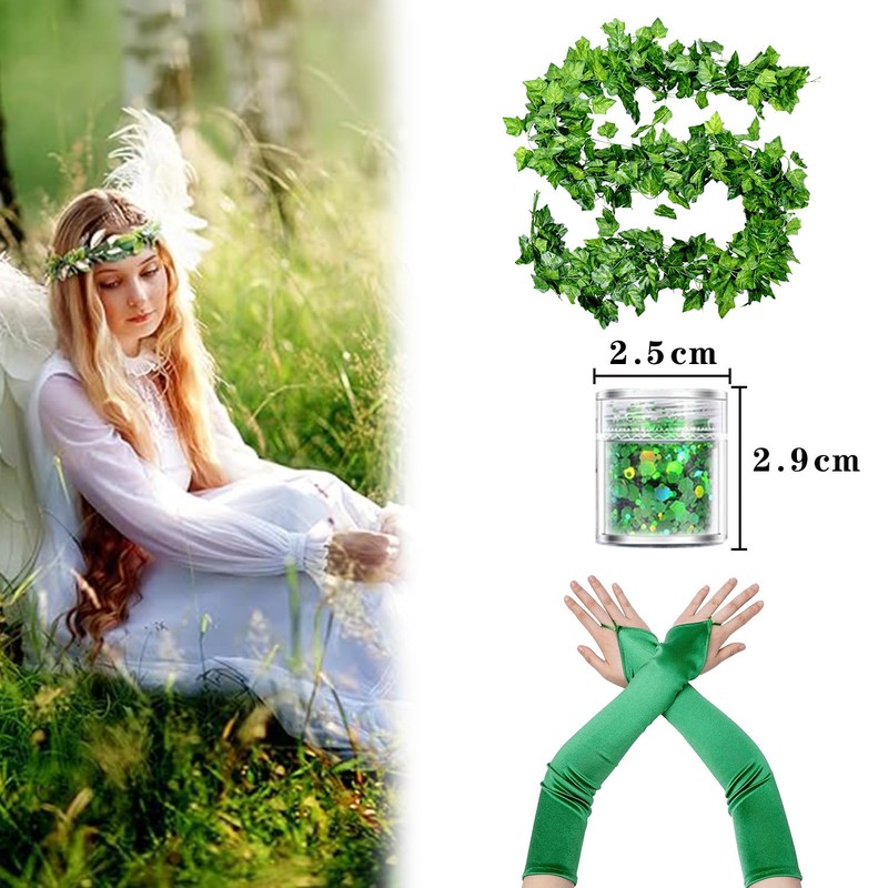 BORFUE 7Pcs Halloween Ivy Costume Accessories Artificial Greenery Ivy Vines Long Satin Green Gloves Fake Leaves Sequin for Halloween Cosplay